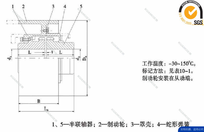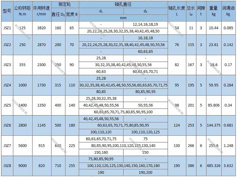 2、承受变动载荷范围大 两个半联轴器与簧片接触的齿面是弧形的,当传递扭矩增大时,弹簧片将沿齿弧面变形,使两个半联轴器作用在簧片上的力 点靠近。簧片与齿面的接触点即力矩的变化,是随着传递扭矩的大小而变化的,它的传动特性是变刚度的。因而它具有比一般弹性联轴器能承受更大的载荷变动量。 传动力使簧片沿齿弧变形时所产生的缓冲作用,尤其在机器起动时或强力冲击载荷时,于相应程度上有保护配套机件。 3、 传动效率高,运行可靠 联轴器的传动效率,经测定达99.47%,其短时超载能力为额定扭矩的两倍,运行可靠。 JSZ型带制动轮型联轴器产品特点: 1、减振性好,使用寿命长 2、承受变动载荷范围大 3、传动效率高,运行可靠 4、噪声低,润滑好 5、结构简单,装拆方便