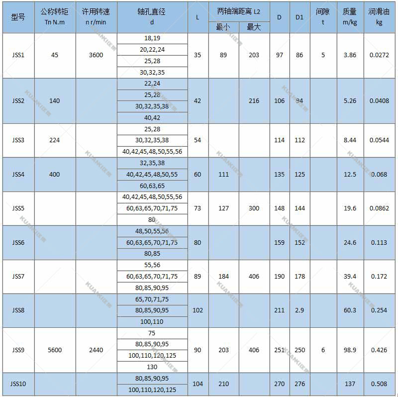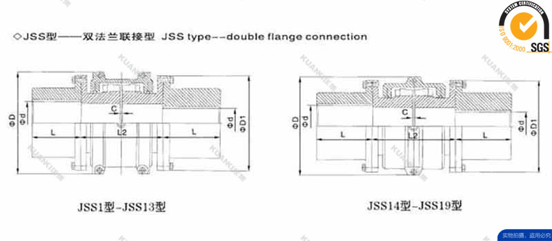 | JSS型双法兰联接型联轴器是一种结构先进的金属弹性联轴器。是以工程塑料作弹性元件,适用于联接两同轴线的传动轴系,具有补偿两轴相对偏移、缓 冲、减震、耐磨性能,适应场合普遍,传递转矩20-35000.N.M,工作温度-35-+80摄氏度并与德国ROTEX联轴器互换。 它以蛇形弹簧片轴向嵌入两半联轴器的齿槽内,来实现原动机与工作机的联接,由于簧片的特殊性能,从而很大程度上避免了原动机与工作机的共振现象,使用寿命 远高于非金属弹性元件联轴器;簧片所接触的齿面为弧形,接触面的大小随传递扭矩的大小而变化,因而它能承受更大的载荷变动量,经测定其短时超载能力为额定 扭矩的2~3倍,传动效率达99.5%,运行可靠;且蛇形弹簧联轴器的结构简单,装拆方便,允许有较大的安装偏差,适用于冲击式的碎煤机、碎石机、曲 柄往复运动、矿山、重型机械、减速机等.